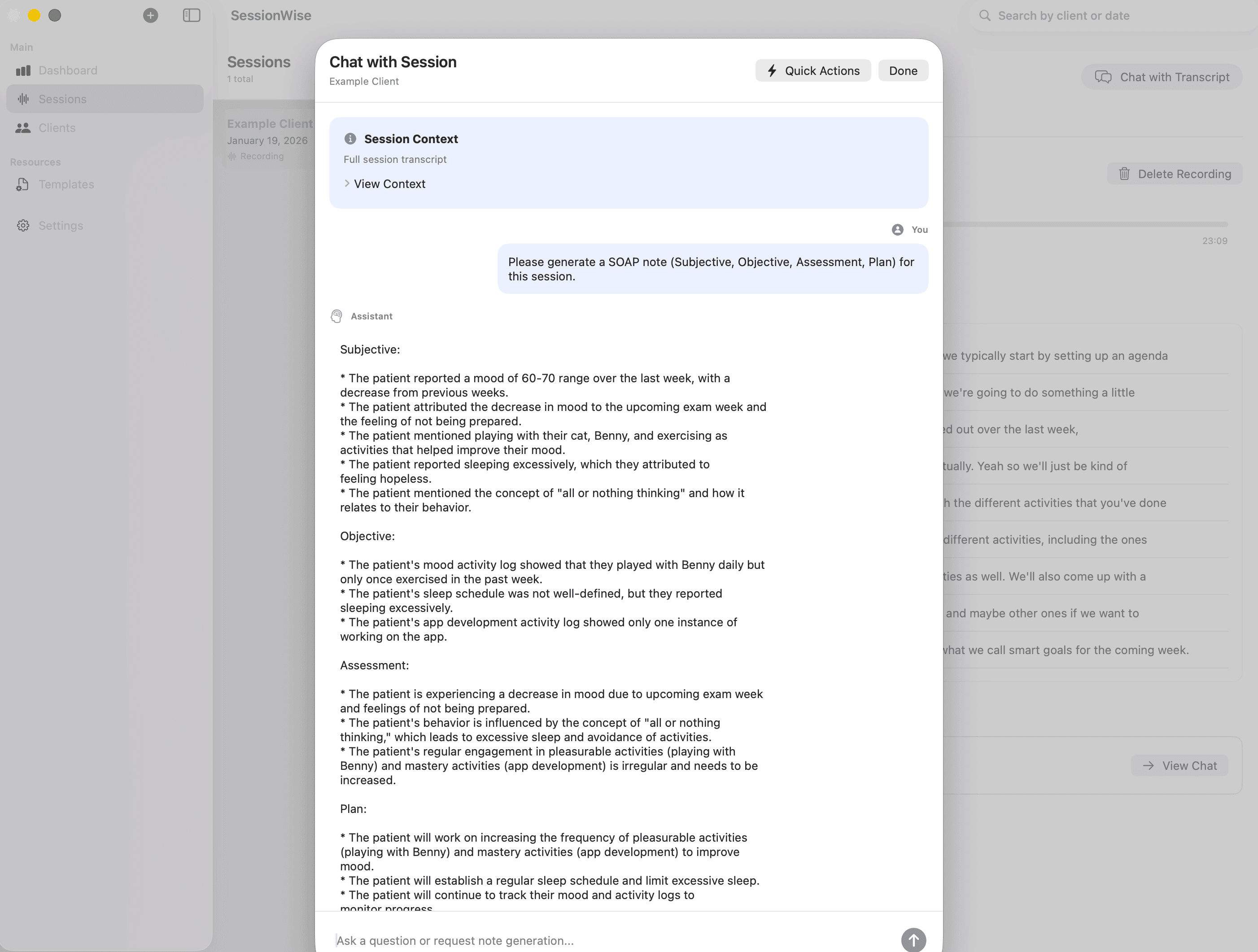Unlike web-based platforms, SessionWise runs locally on macOS. All notes and processing stay on your Mac, keeping client information fully private.